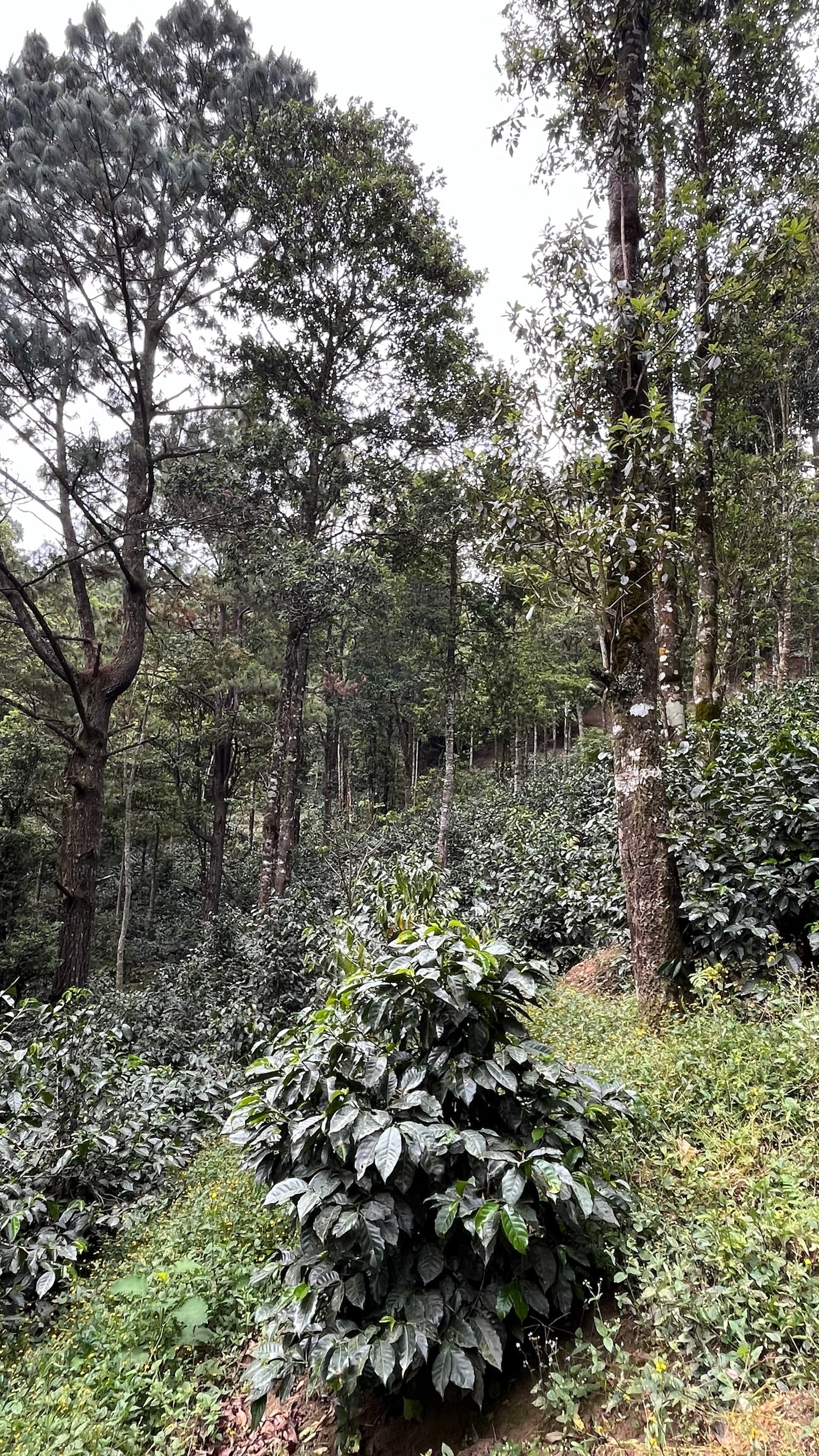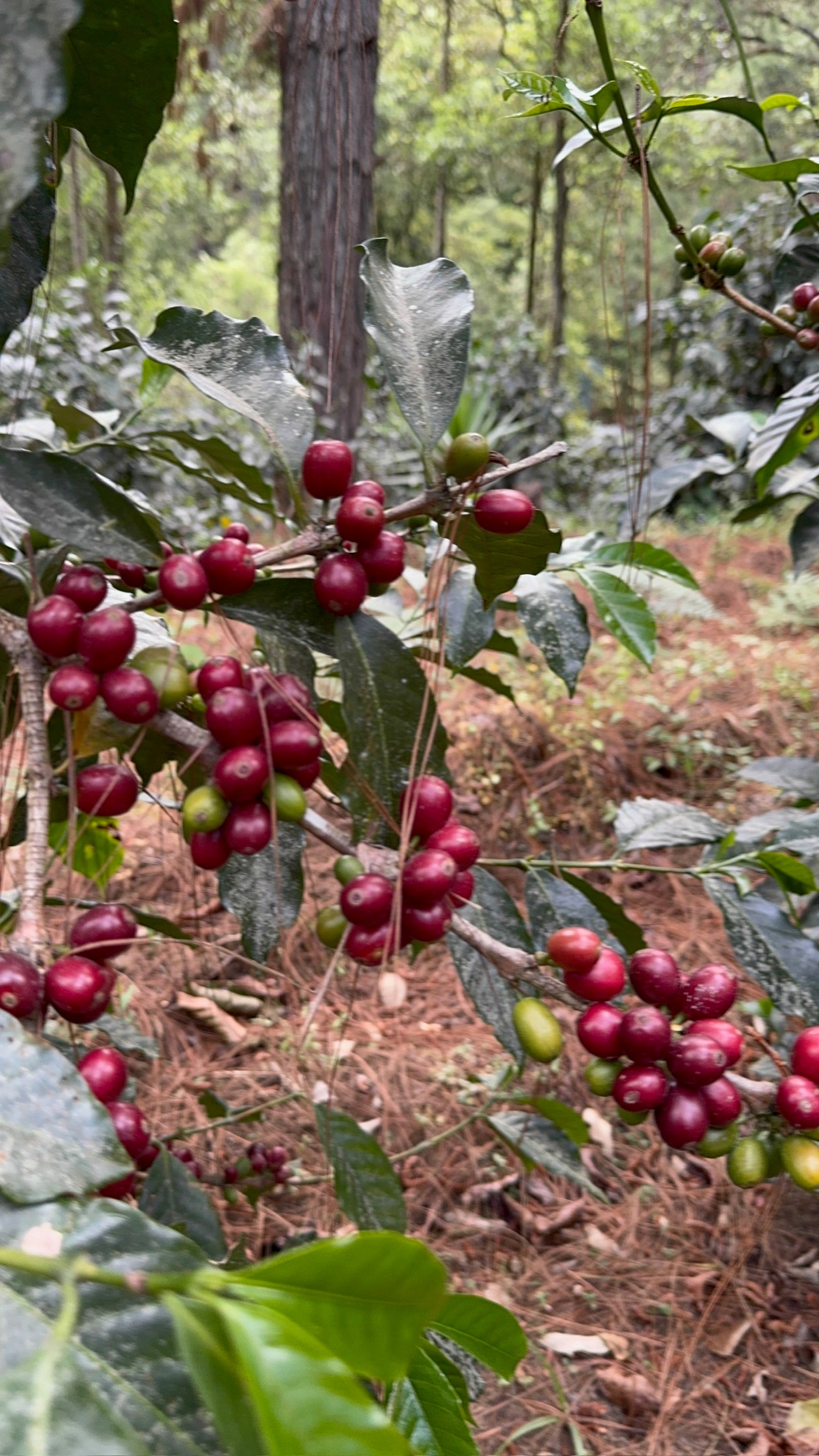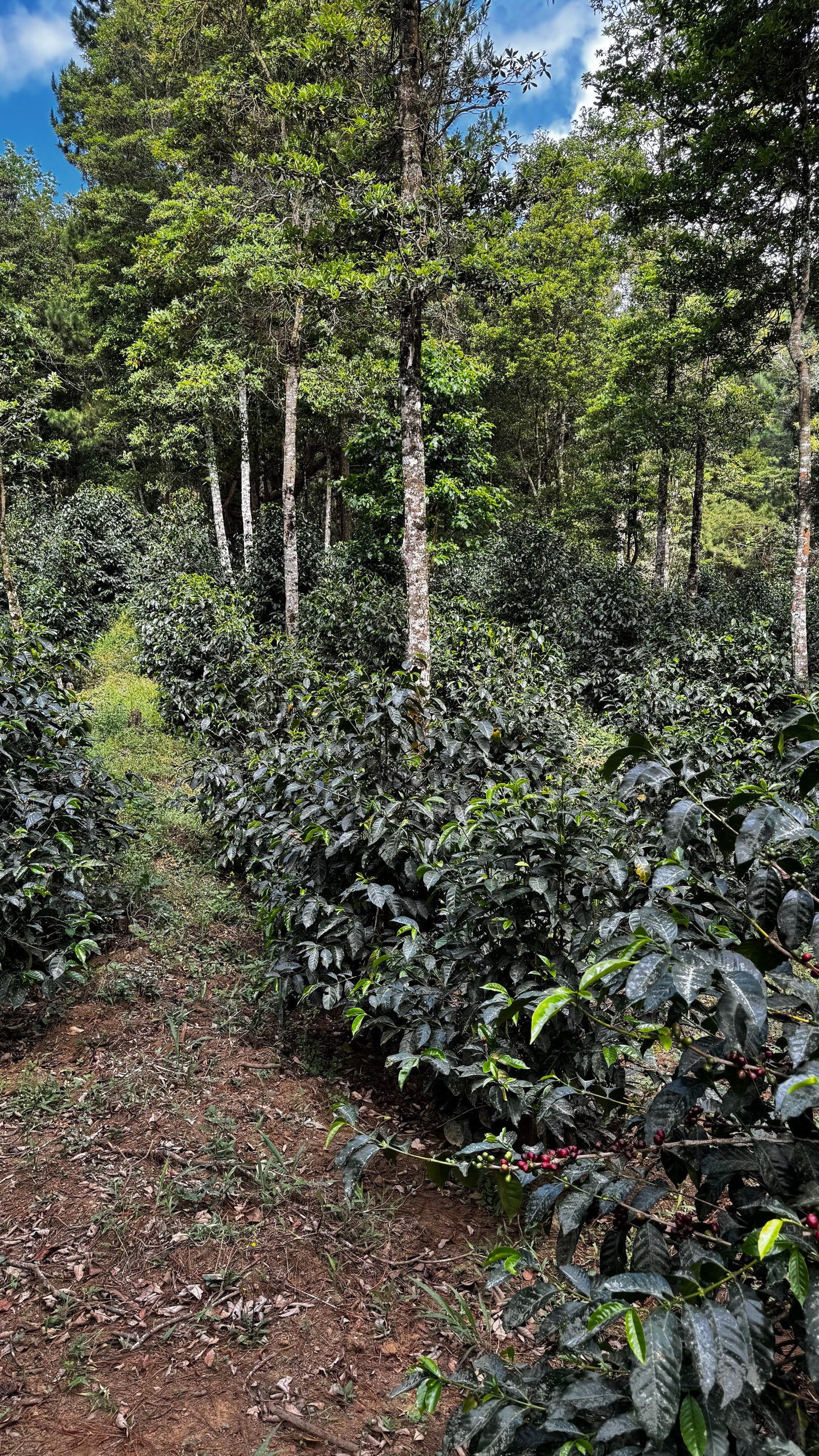 The farmland is steep and the coffee trees grow tall. Bookending the coffee trees are small rivers and a small dam, of which are used to supply the nearby villages with fresh spring water. The native planted trees include pine, which is a nationally protected tree. The tall pine trees provide ground coverage, when they shed their needles, it helps maintain a constant temperature in what becomes a mini microclimate. The air is cool and stable and fresh, and these stable cool temperatures mean the coffee cherries mature very slowly, resulting in late harvests, but incredibly rich and clean cup profiles.